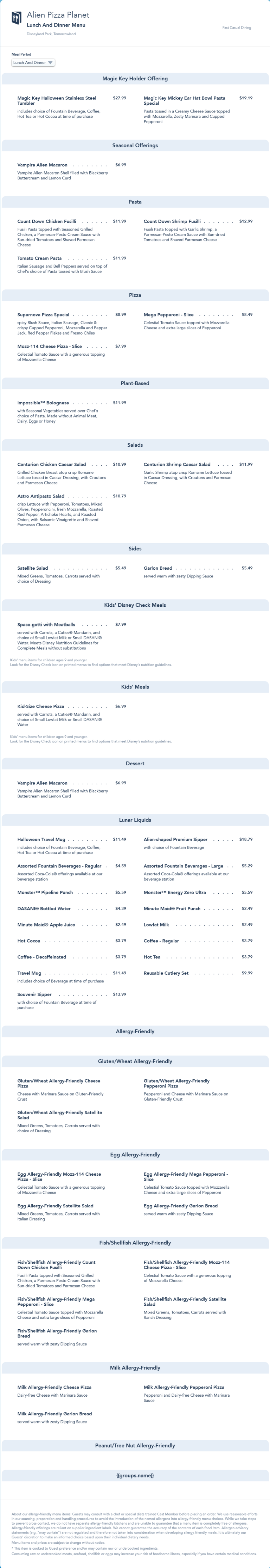 Alien Pizza Planet Lunch/Dinner Menu - October 2022