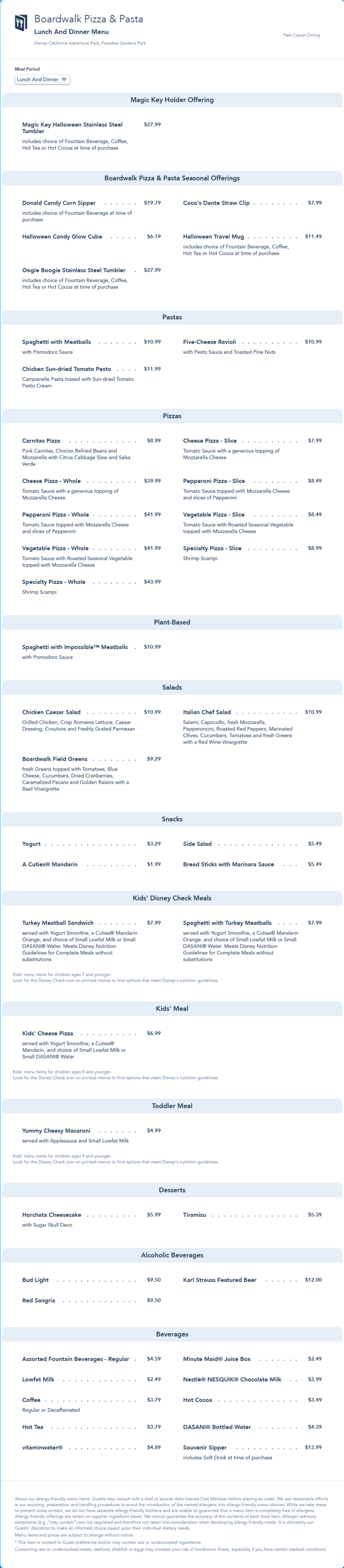 Fall 2022 lunch/dinner menu. This menu added the Carnitas Pizza, Spaghetti with Impossible Meatballs and Fall seasonal items.