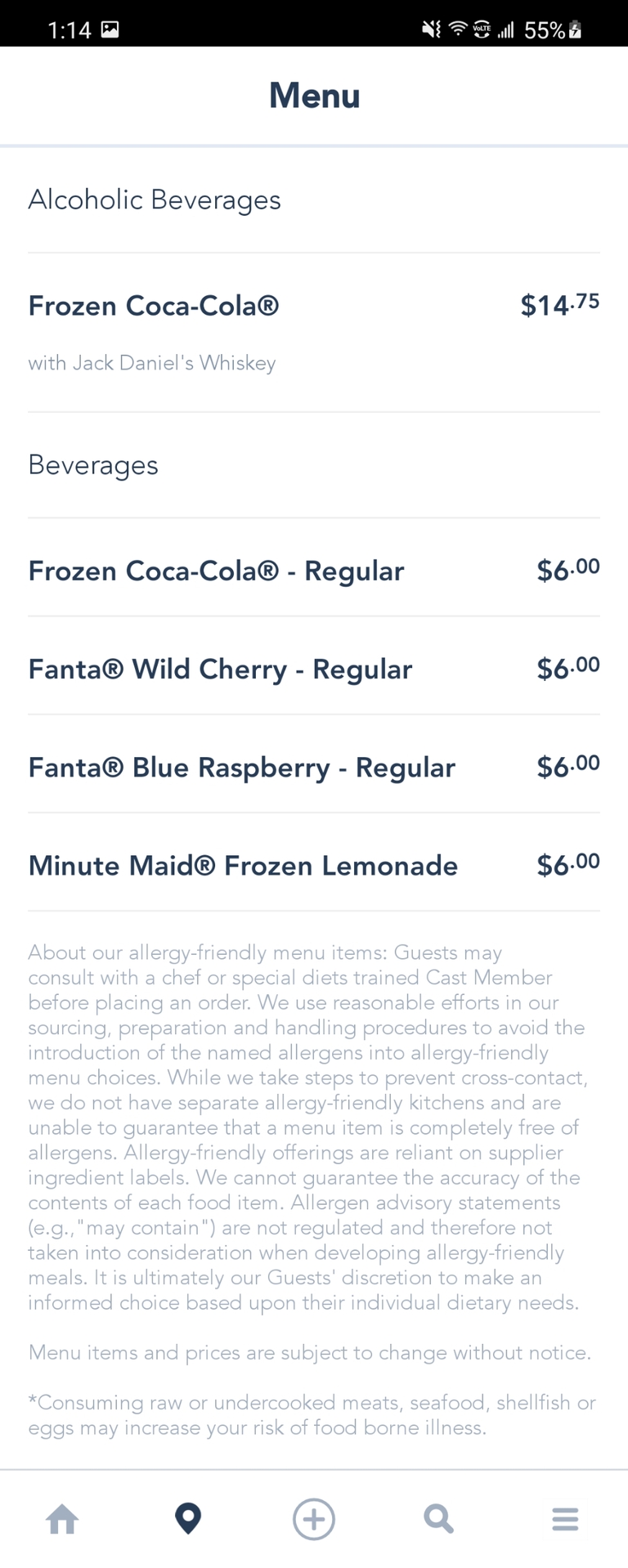 Reopening menu from July 2021. This menu was replaced by an updated menu in September 2021 that increased the price of the Frozen Coca-Cola Alcoholic Beverage by $1.00, from $14.75 to $15.75.