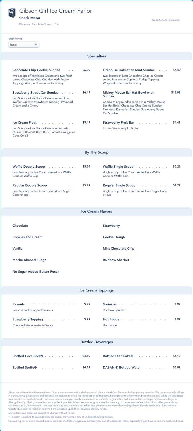Gibson Girl Ice Cream Parlor Snack Menu - April 2021
