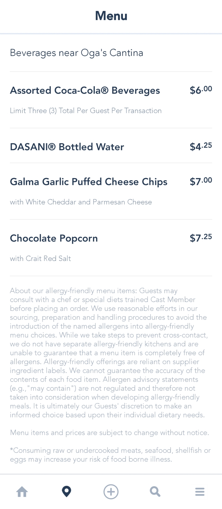 This menu was replaced by an updated menu in May 2022 that added the Sullust Garlic Chips and increased the price of the Galma Garlic Puffed Cheese Chips from $7.00 to $7.25.
