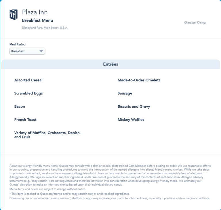 This menu was the Initial Character Dining Breakfast menu from August 12th, 2021.