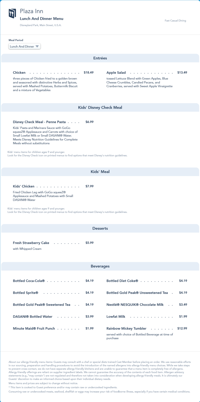 Plaza Inn's reopening menu from April 30th, 2021. It was replaced by an