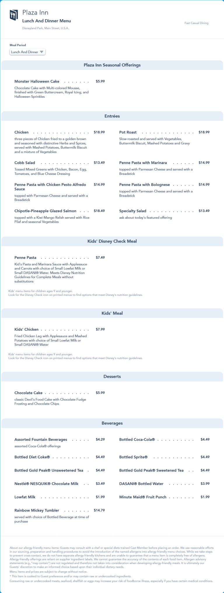 This menu was replaced by an updated lunch/dinner menu that removed the Halloween seasonal Monster Cake, added Christmas seasonal offerings and Disney Merriest Nites event-exclusive Minnie Chicken & Waffle and Maple Blueberry Lemonade.