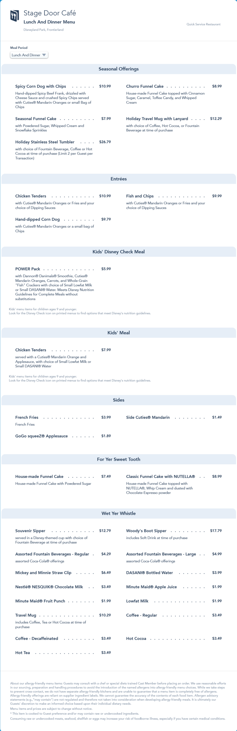 This menu was replaced by an updated menu in January 2022 that removed the holiday seasonal items and added the winter seasonal Strawberry Cheesecake Funnel Cake.