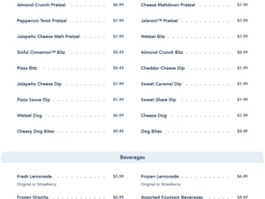 Sink your teeth into a plethora of fresh-baked pretzels in flavors like Jalapeno Cheese Melt and Sinful Cinnamon—or add tasty dips, Cheesy Dog Bites and Pizza Bitz for the ultimate pretzel party! Thirsty? Fresh-squeezed and frozen lemonade are also available as an added treat.